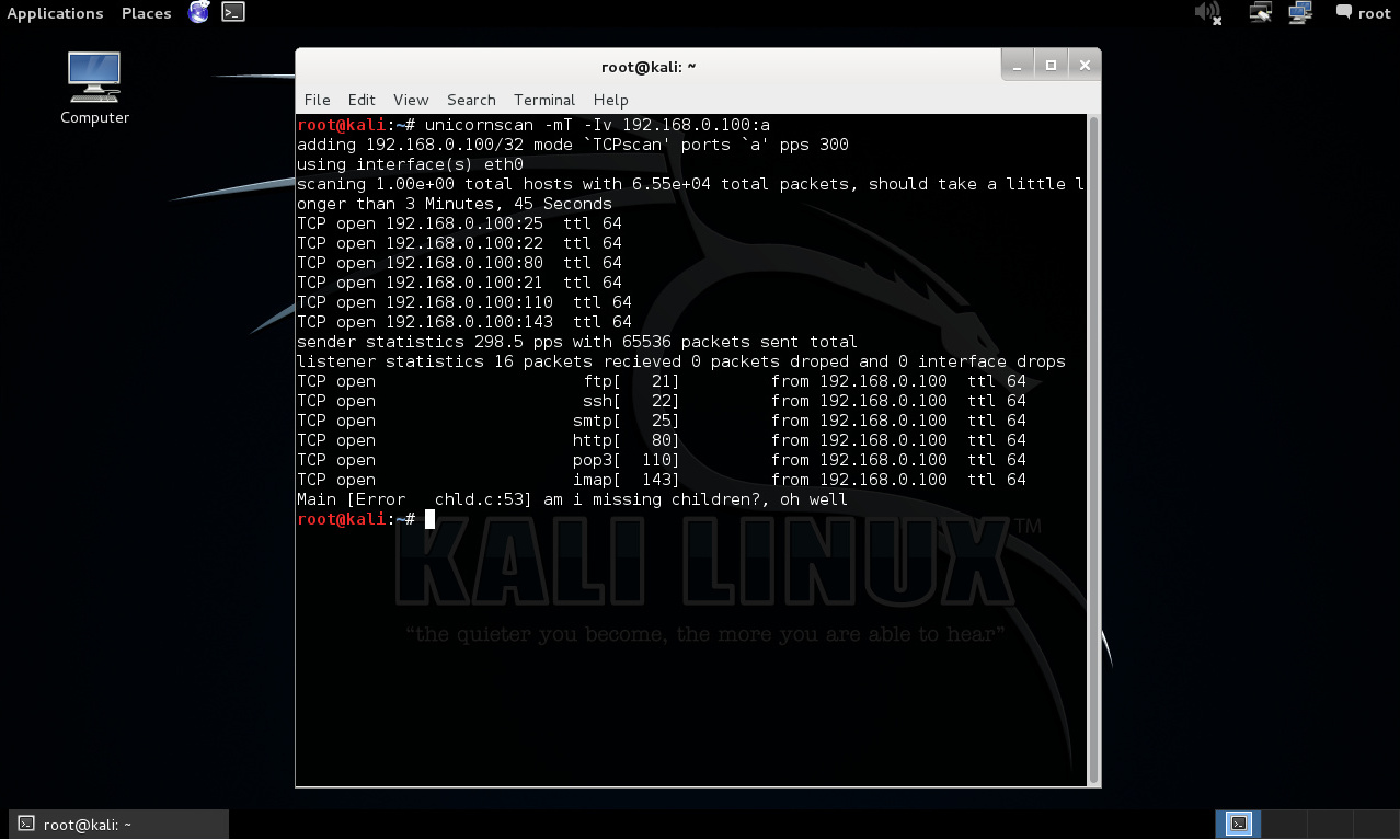 # unicornscan -mT -Iv 192.168.0.100:a