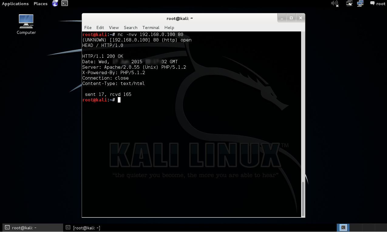 Puerto TCP/80: La respuesta recibida desde el puerto 80 utilizando netcat, en primera instancia no expone ningún dato relevante, razón por la cual se hace necesario interactuar con el servicio enviando el método “HEAD” solicitando el recurso “/” utilizando la versión 1.0 del protocolo HTTP. Esto expone la utilización de un servidor Apache/2.0.55 (Unix) y PHP/5.1.2.