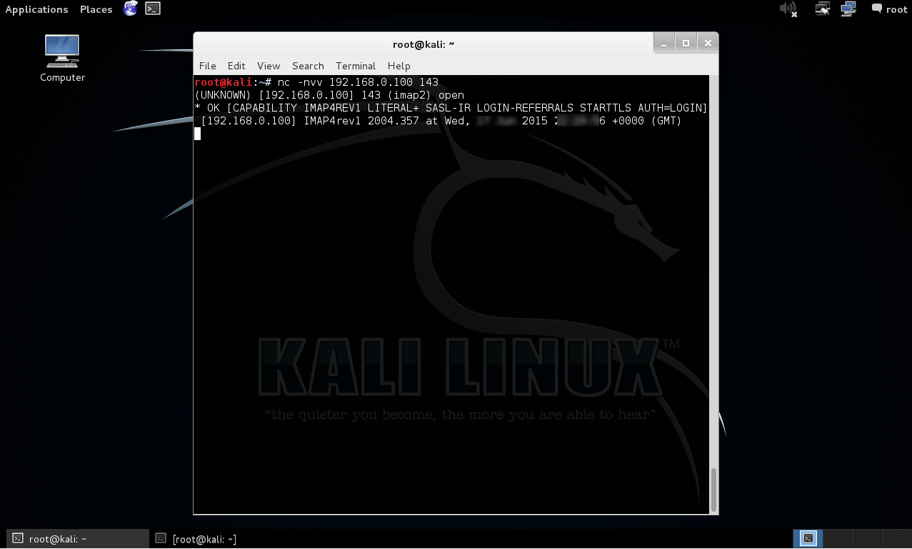 Puerto TCP/143: La respuesta recibida desde el puerto 143 utilizando netcat, expone un servicio IMAP, adicionalmente se expone la información IMAP4rev1 2004.357 y sus capacidades. Una búsqueda en Google con esta información expuesta permite inferir la posible utilización de WU-IMAP.