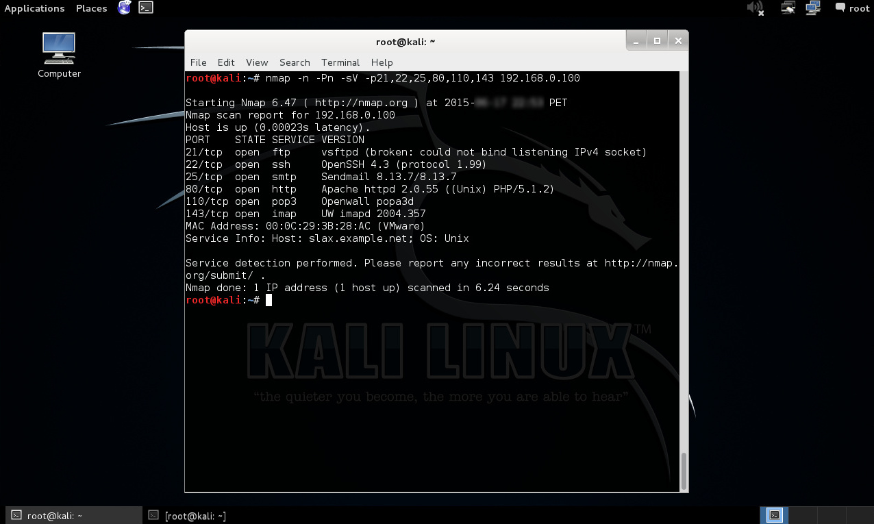 # nmap -n -Pn -sV -p21,22,25,80,110,143 192.168.0.100