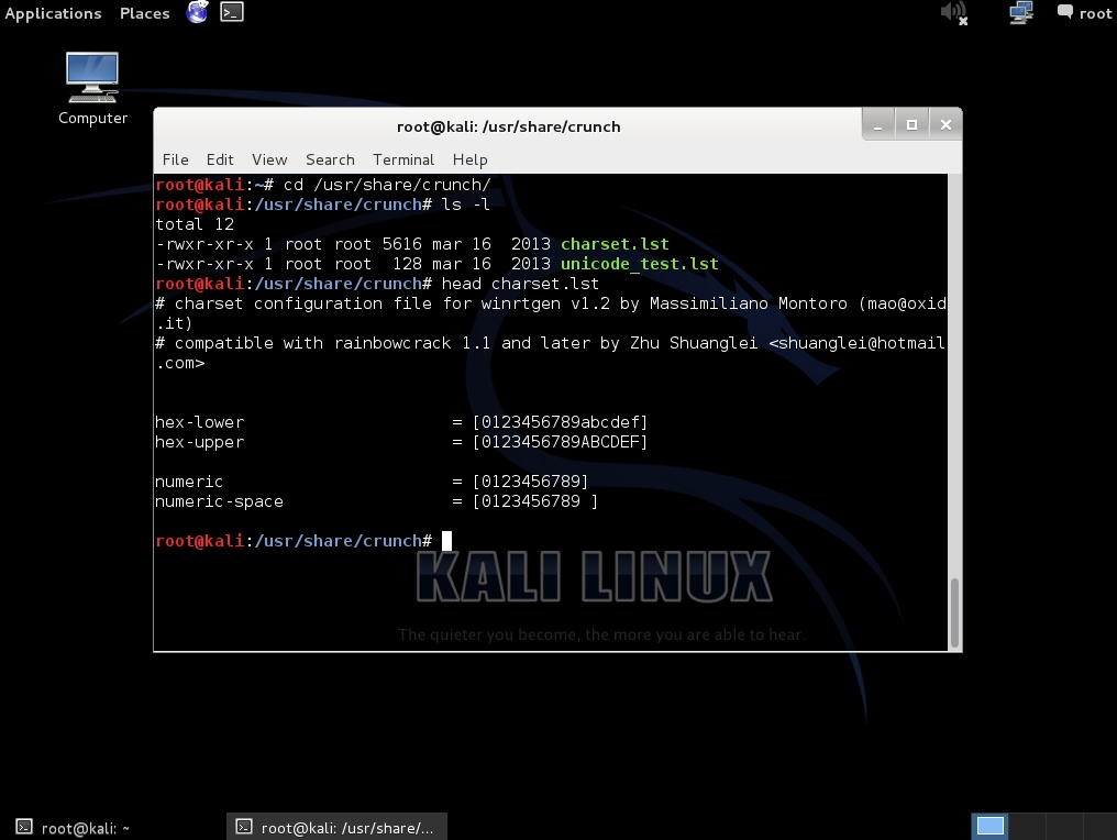 Los conjuntos de caracteres por defecto están ubicados en el directorio “/usr/share/crunch/”. En la siguiente imagen se muestra el contenido de este directorio y las primeras lineas del archivo charset.lst.
