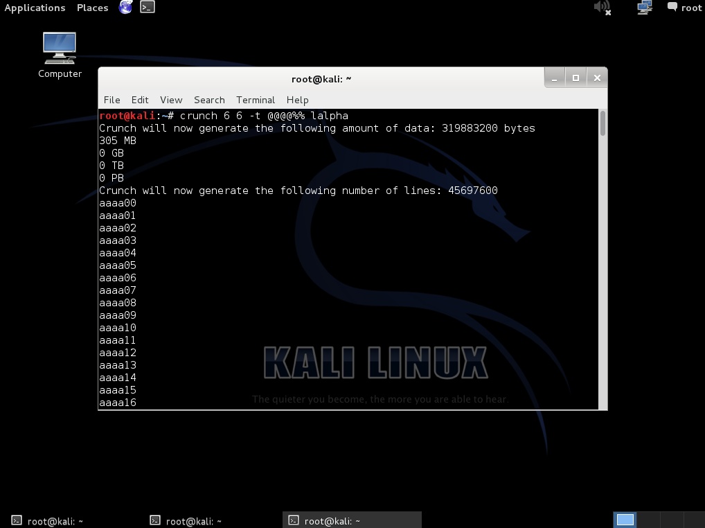 La manera más sencilla de ejecutar Crunch es definiendo la longitud mínima (de inicio) y máxima (de fin) de la cadena que se desea crear. La opción “-o” especifica el archivo al cual escribir los resultados.