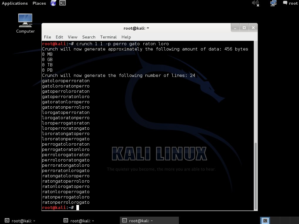 Otra interesante capacidad de Crunch es la de generar permutaciones desde un conjunto de caracteres o cadenas de caracteres. Los números incluidos en el comando son ignorados pero deben ser especificados. En este caso se utilizan cuatro palabras que constituirán la lista de palabras de la posibles contraseñas creadas por Crunch.