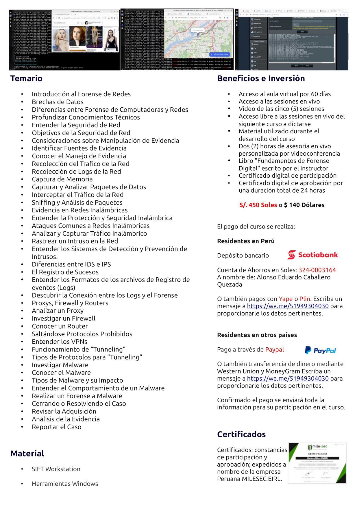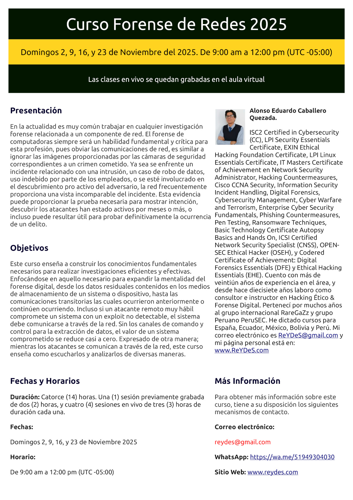 Este curso enseña a construir los conocimientos fundamentales necesarios para realizar investigaciones eficientes y efectivas. Enfocándose en aquello necesario para expandir la mentalidad del forense digital, desde los datos residuales contenidos en los medios de almacenamiento de un sistema o dispositivo, hasta las comunicaciones transitorias las cuales ocurrieron anteriormente o continúen ocurriendo. Incluso si un atacante remoto muy hábil compromete un sistema con un exploit no detectable, el sistema debe comunicarse a través de la red. Sin los canales de comando y control para la extracción de datos, el valor de un sistema comprometido se reduce casi a cero. Expresado de otra manera; mientras los atacantes se comunican a través de la red, este curso enseña como escucharlos y analizarlos de diversas maneras.