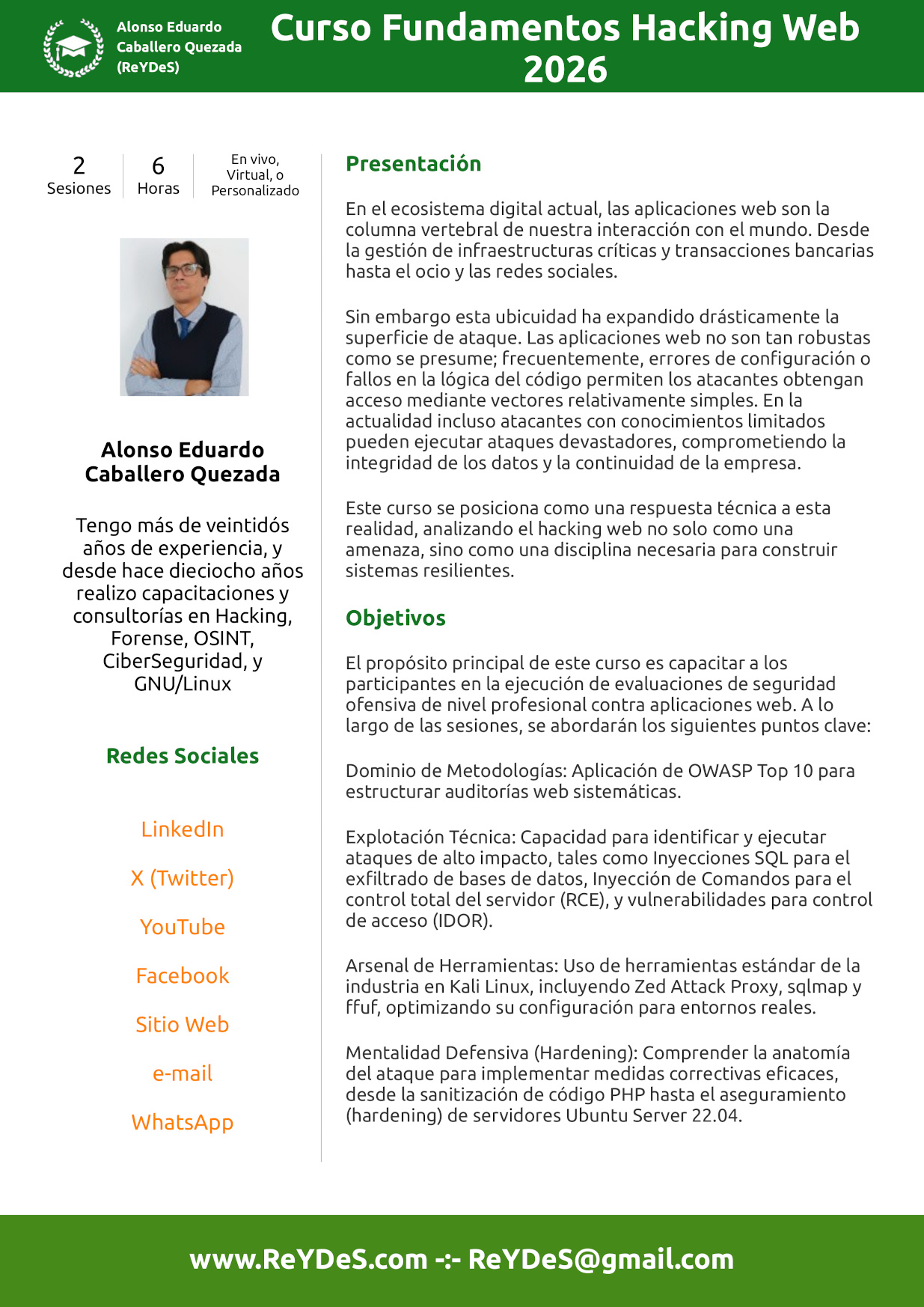 Este curso enseña a los participantes a realizar evaluaciones de seguridad contra aplicaciones web, de tal manera se puedan también prevenir los ataques. Se abarca la teoría, herramientas, y tecnologías utilizadas para identificar y explotar las vulnerabilidades web más dañinas, y frecuentemente presentes en las aplicaciones web. Esto significa tener la capacidad de obtener información sensible desde una base de datos, evadir una página de autenticación, o realizar suplantación de los usuarios. Se expondrá sobre como realizar los ataques, cuales herramientas son requeridas, y como utilizarlas de manera óptima.