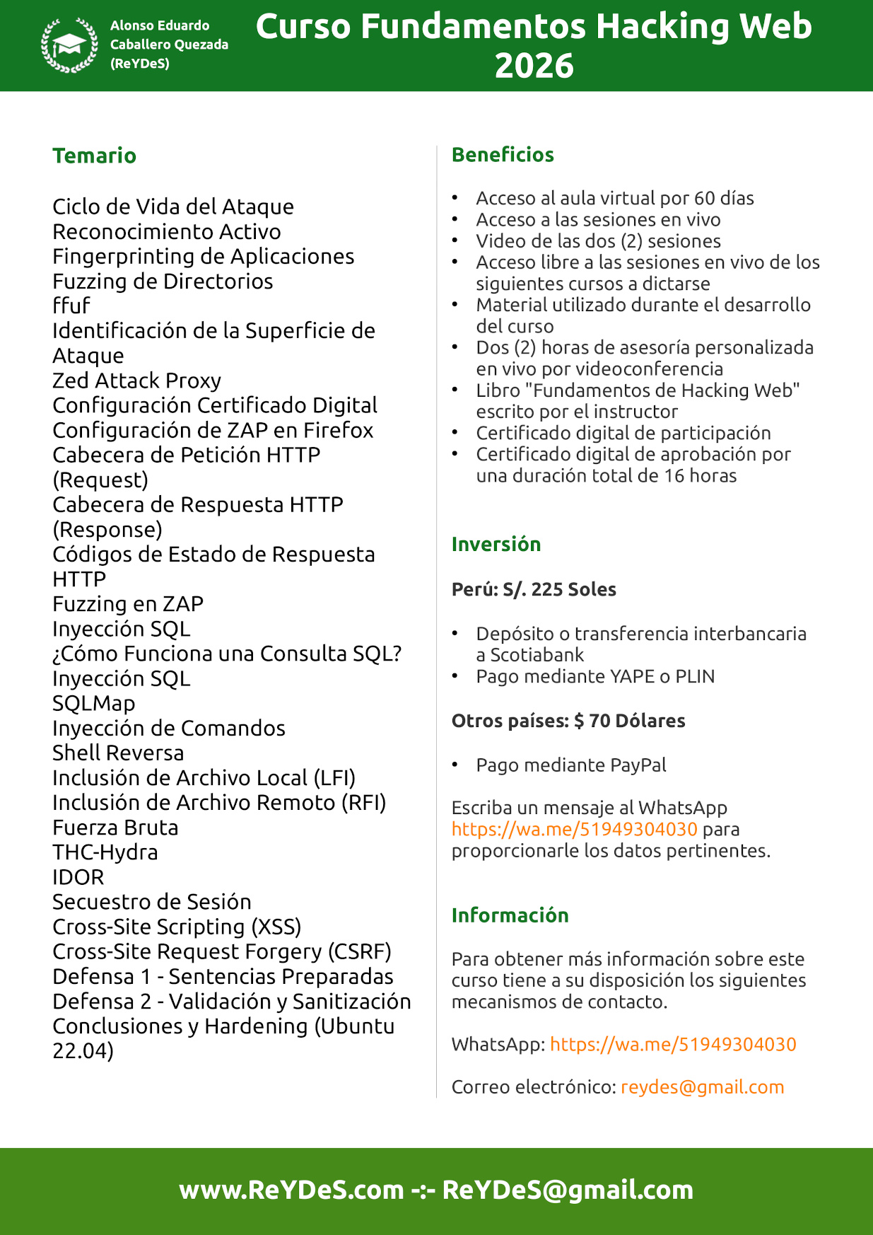Para obtener más información del curso o registrar su participación, escribir al whatsapp https://wa.me/51949304030 o al correo electrónico al correo reydes@gmail.com. También el curso está permanentemente disponible en un aula virtual para su acceso inmediato.