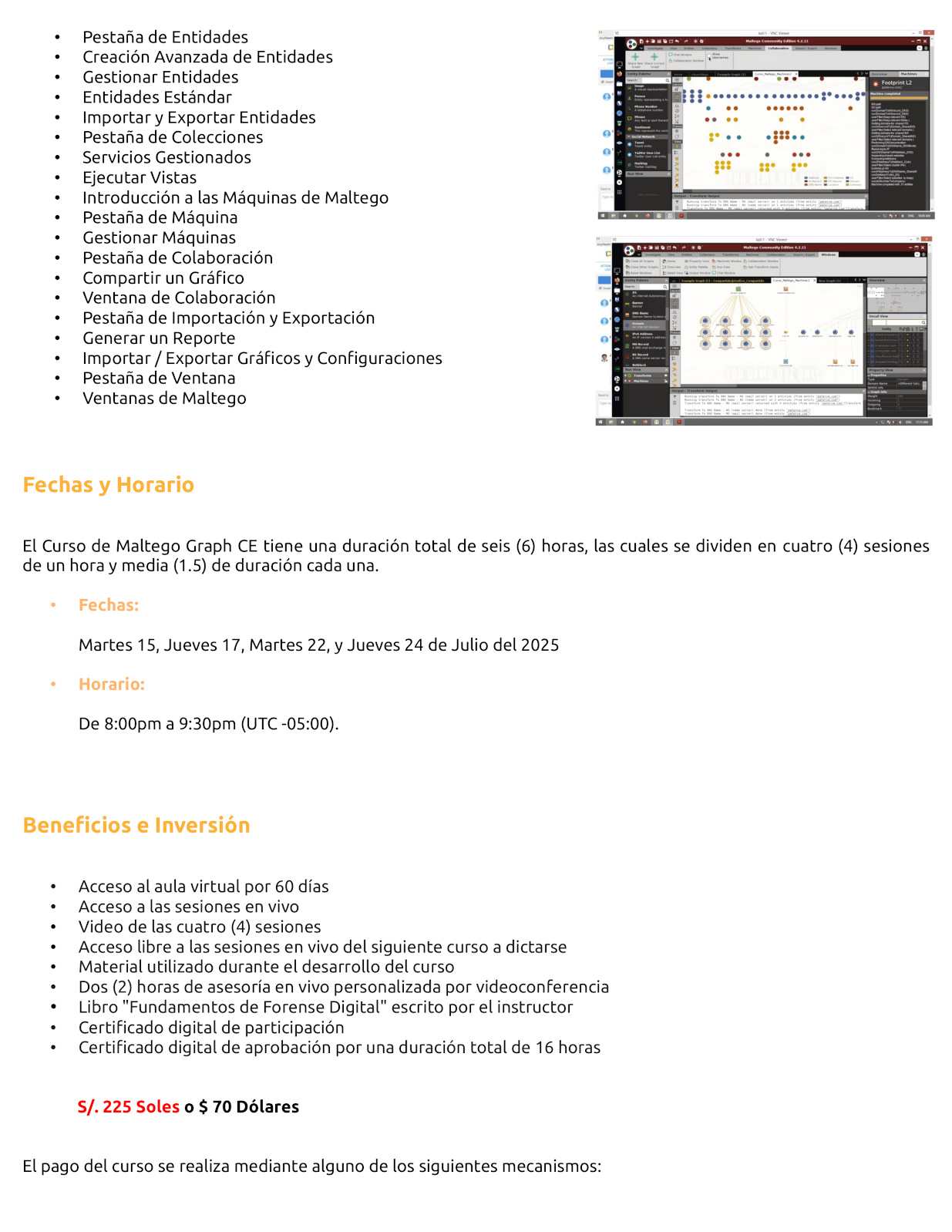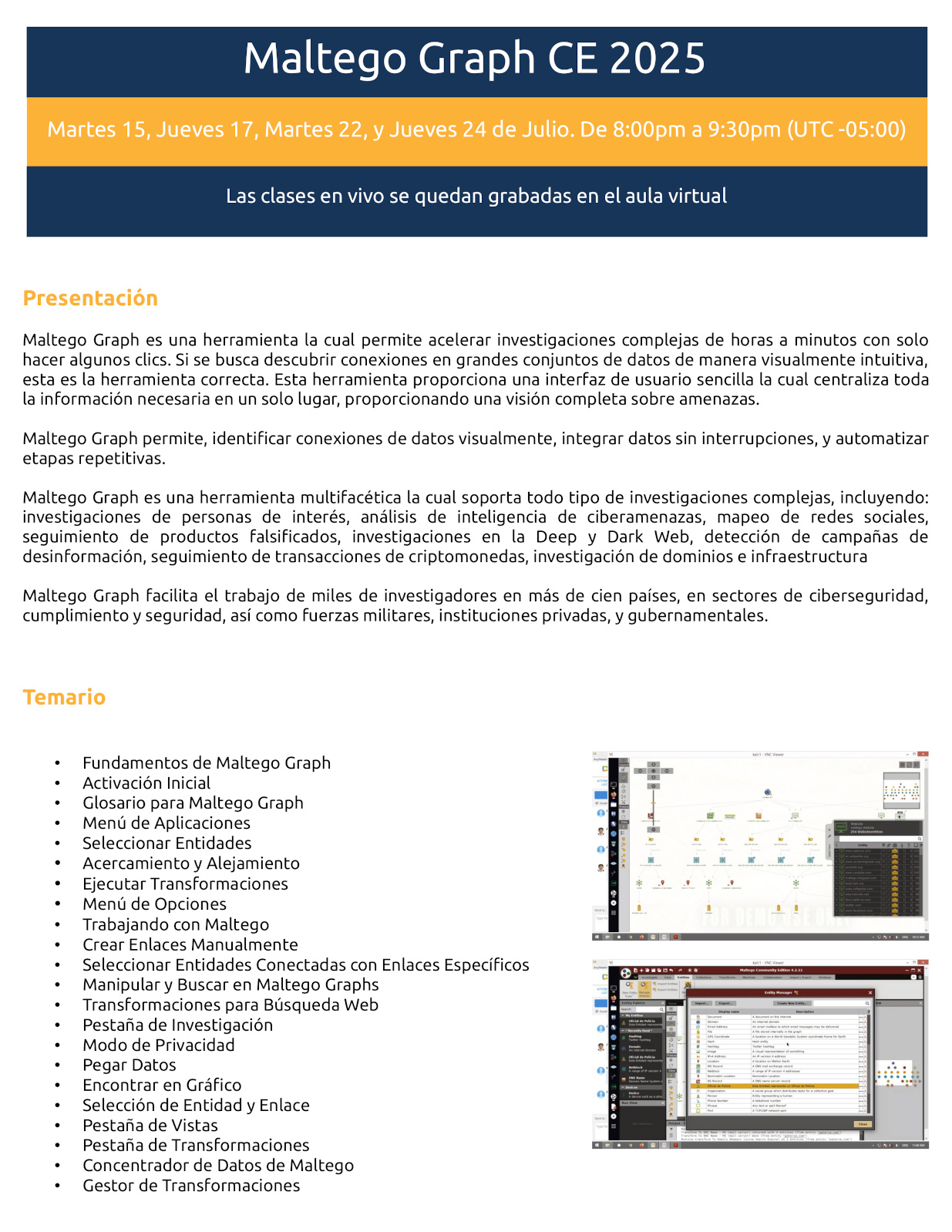 Maltego Graph es una herramienta multifacética la cual soporta todo tipo de investigaciones complejas, incluyendo: investigaciones de personas de interés, análisis de inteligencia de ciberamenazas, mapeo de redes sociales, seguimiento de productos falsificados, investigaciones en la Deep y Dark Web, detección de campañas de desinformación, seguimiento de transacciones de criptomonedas, investigación de dominios e infraestructura