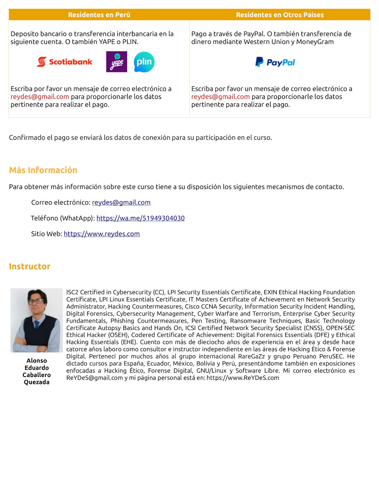 Para obtener más información del curso o registrar su participación, escribir al whatsapp https://wa.me/51949304030 o al correo electrónico reydes@gmail.com. También el curso está permanentemente disponible en un aula virtual. Gracias.