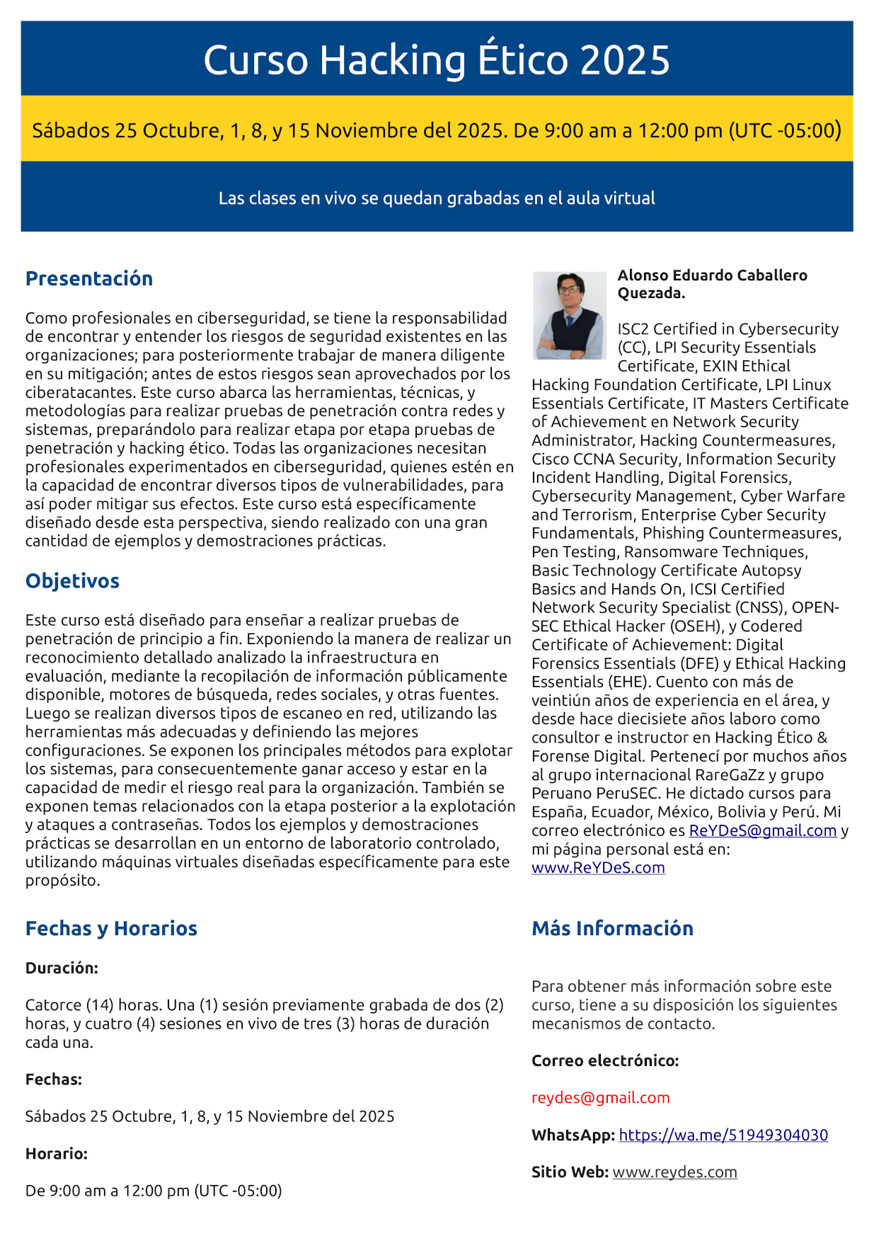 Para obtener más información del curso o registrar su participación, escribir al whatsapp https://wa.me/51949304030 o al correo electrónico al correo reydes@gmail.com. También el curso está permanentemente disponible en un aula virtual. Gracias.