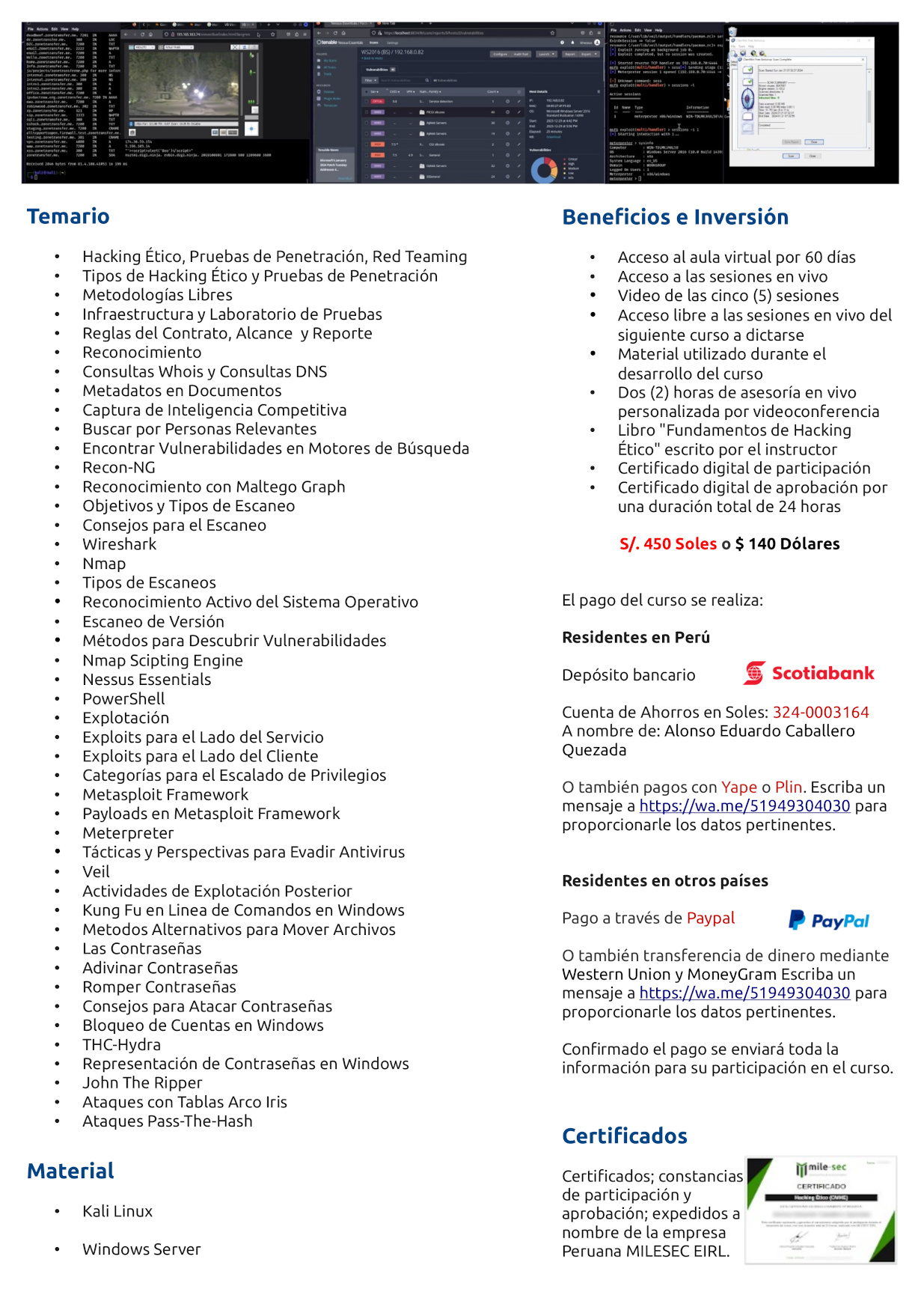 Como profesionales en ciberseguridad, se tiene la única responsabilidad de encontrar y entender las vulnerabilidades presentes en la organización, para luego trabajar diligentemente en mitigarlas antes de estas sean aprovechadas por los atacantes maliciosos. Este curso abarca las herramientas, técnicas y metodologías para realizar pruebas de penetración contra redes y sistemas, y así estar en la capacidad de realizar proyectos de pruebas de penetración exitosamente. Todas las organizaciones necesitan personal experimentado en seguridad de la información, quienes puedan encontrar vulnerabilidades y mitigar sus efectos. Con este curso se estará en la capacidad de realizar pruebas de penetración y hacking ético, aplicando los conocimientos, herramientas, y técnicas explicadas detalladamente. Consecuentemente descubrir y explotar vulnerabilidades en entornos reales, demostrando así todos los conocimientos adquiridos.