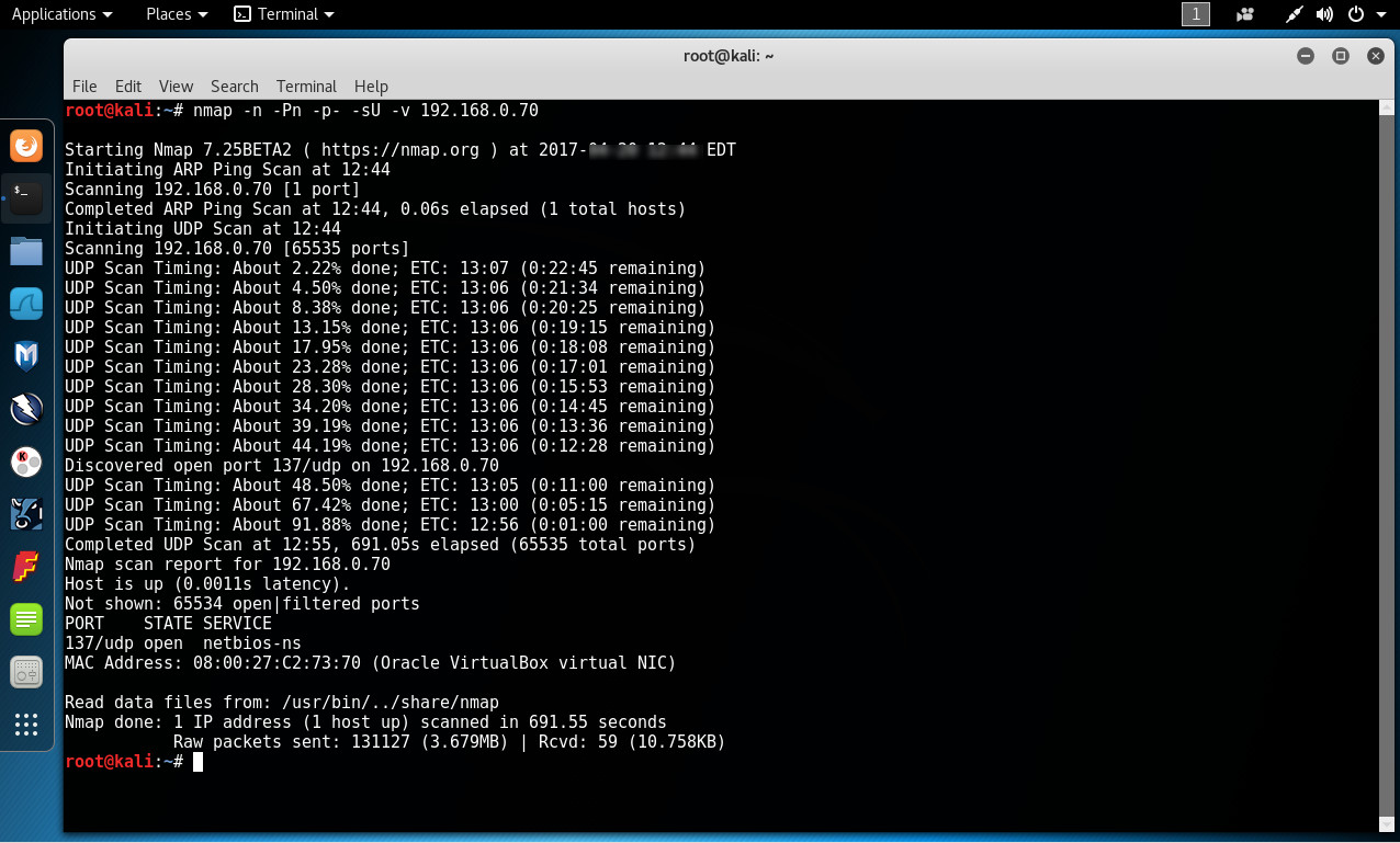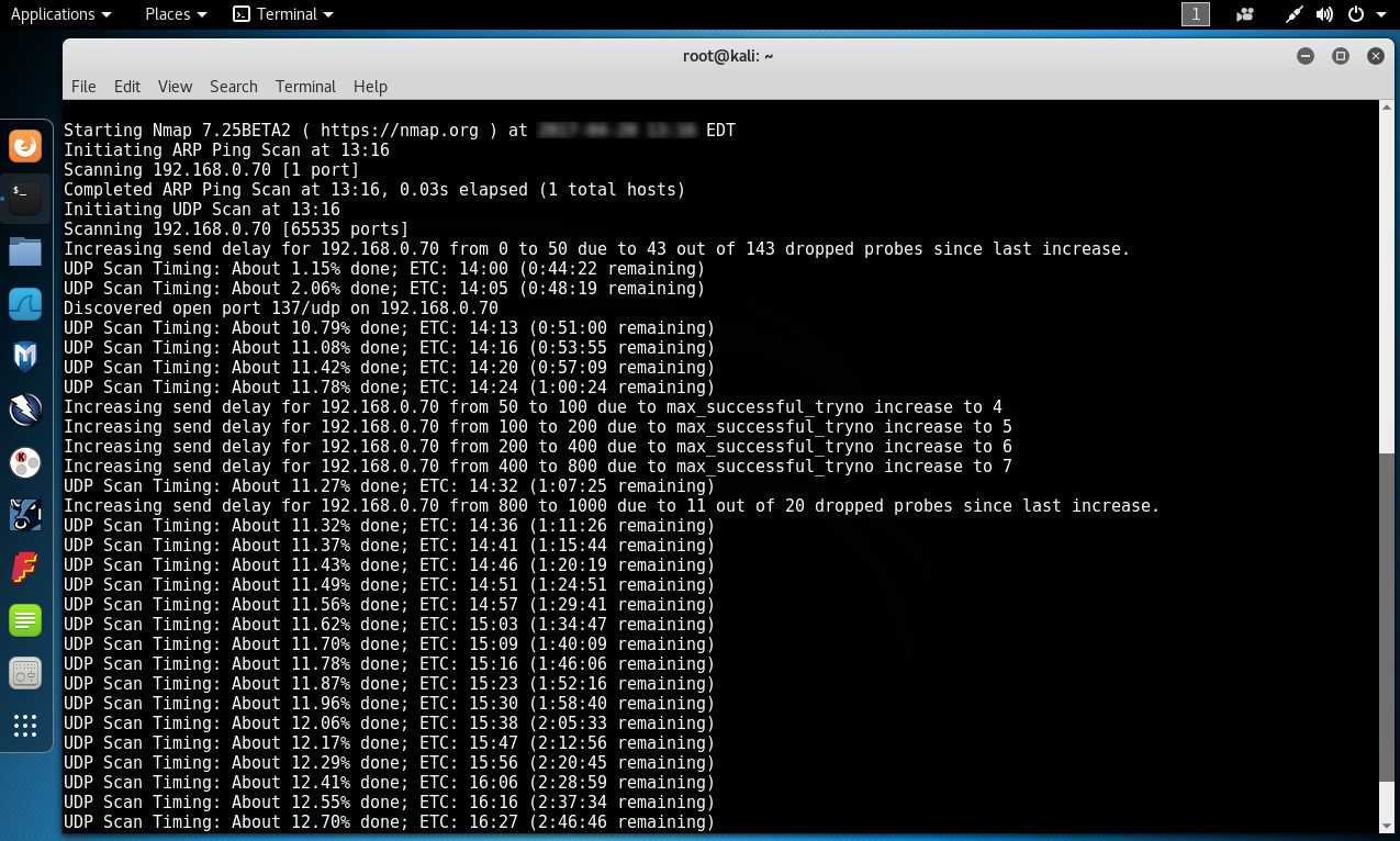 Se realiza nuevamente el escaneo UDP utilizando Nmap. Este escaneo con un avance del casi el 13% debería finalizar luego de aproximadamente 2 horas y 50 minutos. Esto difiere sustancialmente del escaneo realizado cuando el Firewall de Windows estaba activo, por las razones ya mencionadas sobre como funciona el protocolo UDP, y como Nmap realiza este tipo de escaneo.