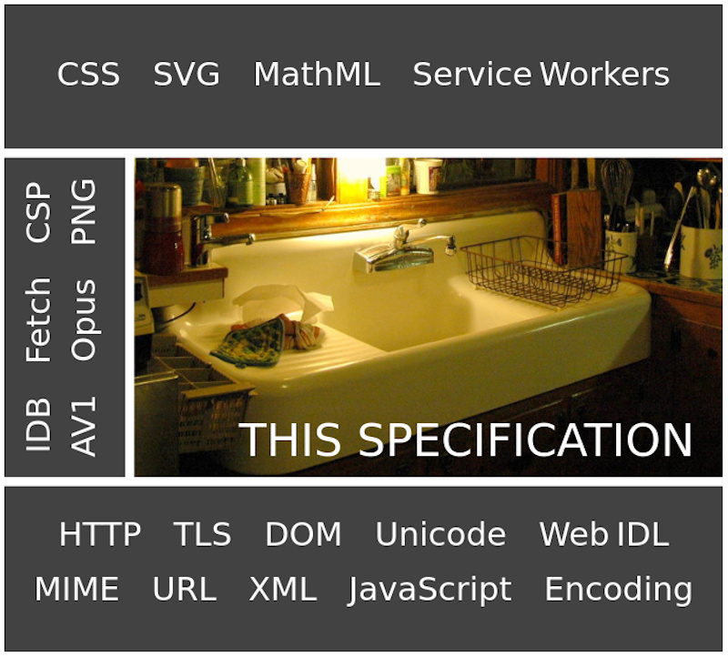 Esta especificación define una gran parte de la plataforma web con mucho detalle. Su lugar en la pila de especificaciones de la plataforma web en relación con otras especificaciones, se puede resumir mejor como se muestra en la imagen.