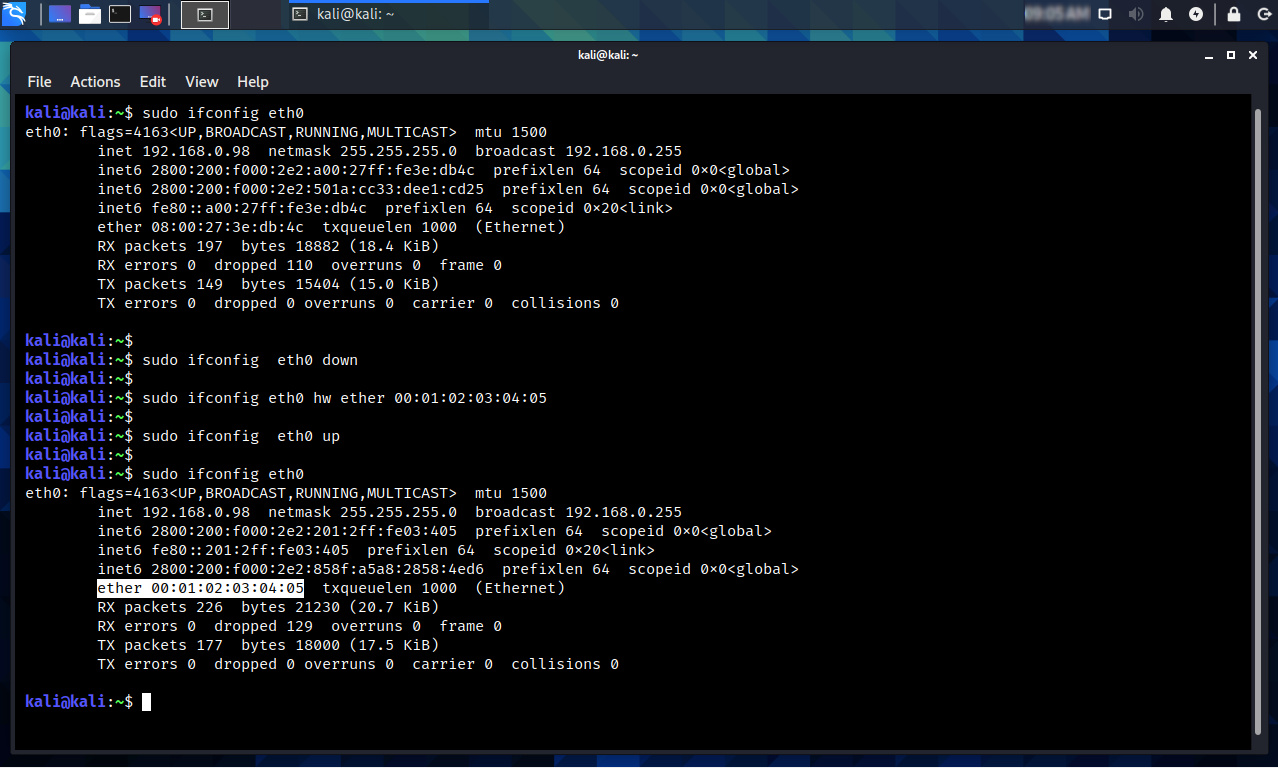 $ sudo ifconfig eth0 hw ether 00:01:02:03:04:05