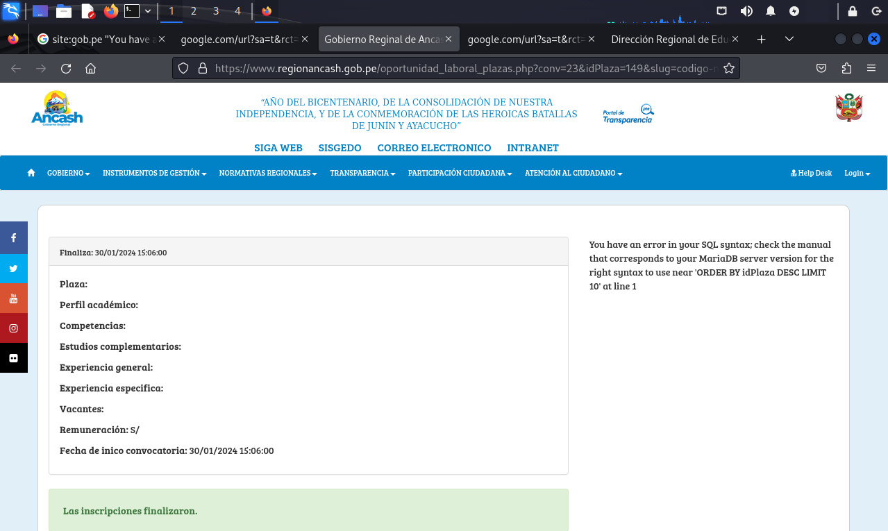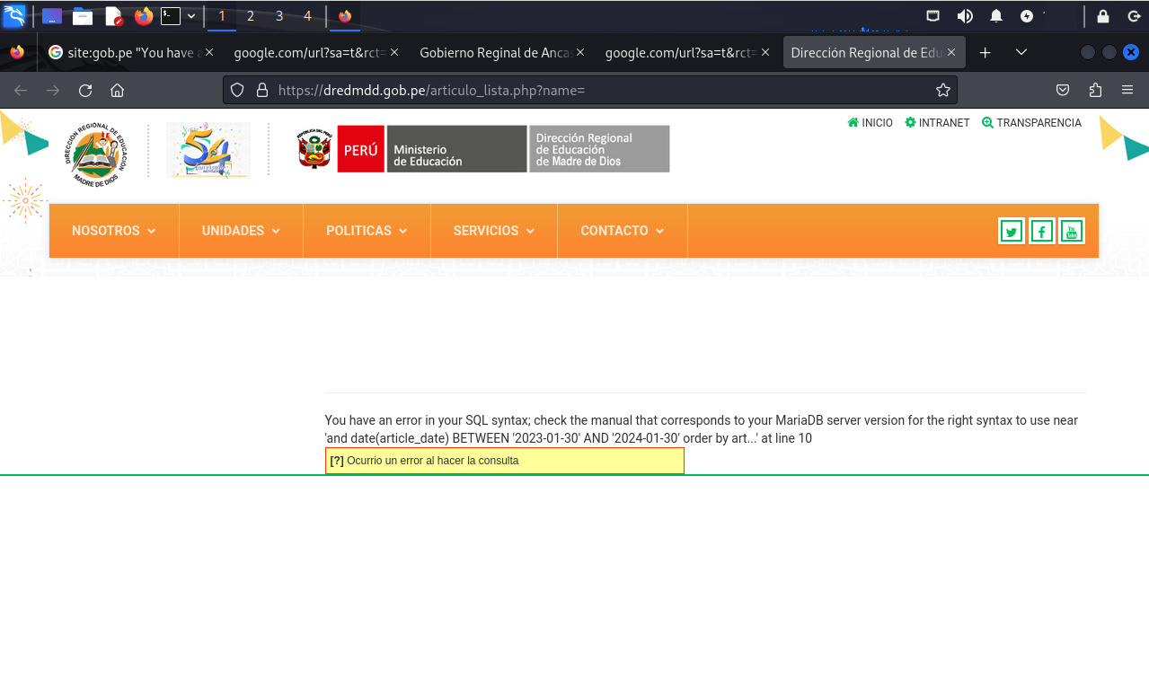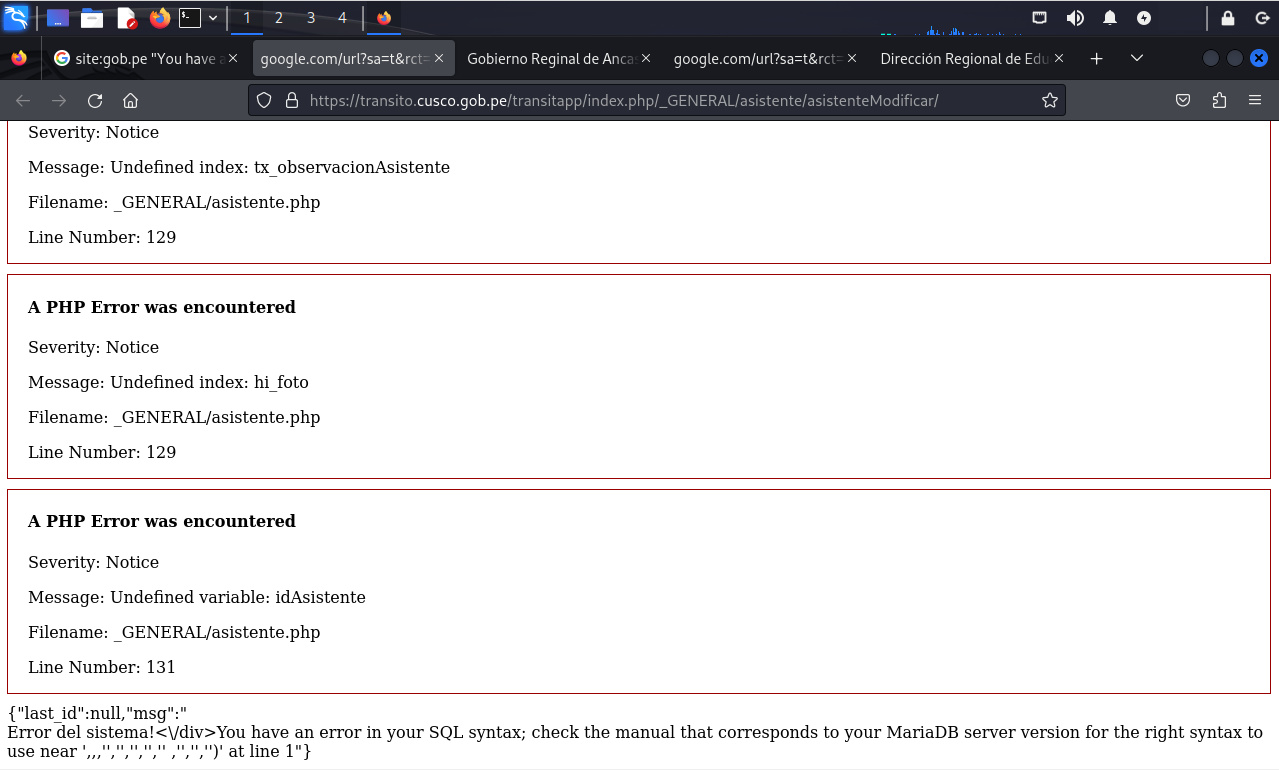 Para el cuarto escenario, el mensaje de error expone también información del servidor (MariaDB), además parte de la consulta y nombres de tabla.