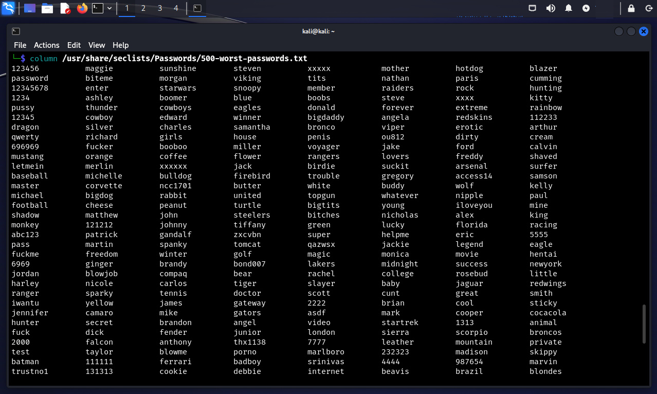 $ column /usr/share/seclists/Passwords/500-worst-passwords.txt