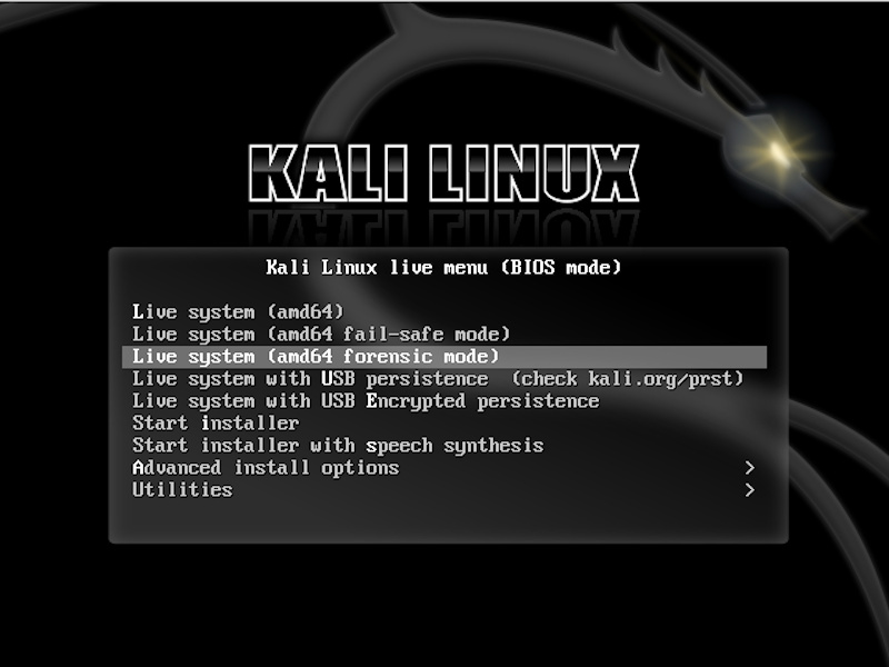 Kali Linux “Vivo” (Live) proporciona un “modo forense”, una característica introducida primero en BackTrack Linux. La opción "Inicio vivo en modo forense" ha probado ser muy popular por varias razones: