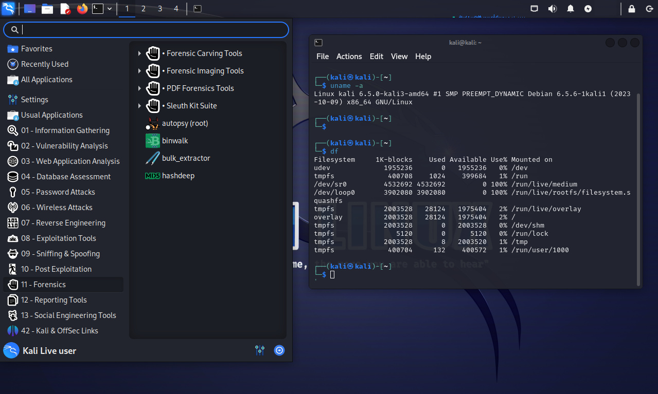 1. Primero, el disco duro interno nunca es tocado. Si existe una partición de intercambio (swap), no se utilizará, y no se montará automáticamente ningún disco interno. Esto se verificó tomando primero un sistema estándar y eliminando el disco duro. Se generó un hash desde la unidad utilizando un paquete forense comercial. Luego se volvió a conectar el disco hacia la computadora para iniciar Kali Linux “Vivo” en modo forense. Después de utilizar Kali por un período de tiempo, se apagó el sistema, se retiró el disco duro, y se generó nuevamente un hash. Estos hashes coincidieron, lo cual indica en ningún momento se cambió sobre el disco.