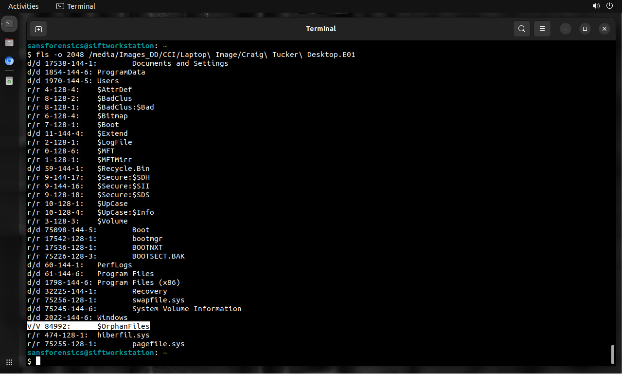 A partir de The Sleuth Kit versión 3, los archivos huérfanos se enumeran en el directorio $OrphanFiles en el directorio raíz. Tener en consideración este directorio en realidad no existe en la imagen del disco, es solo una forma virtual para The Sleuth Kit brinde acceso hacia los metadatos existentes.