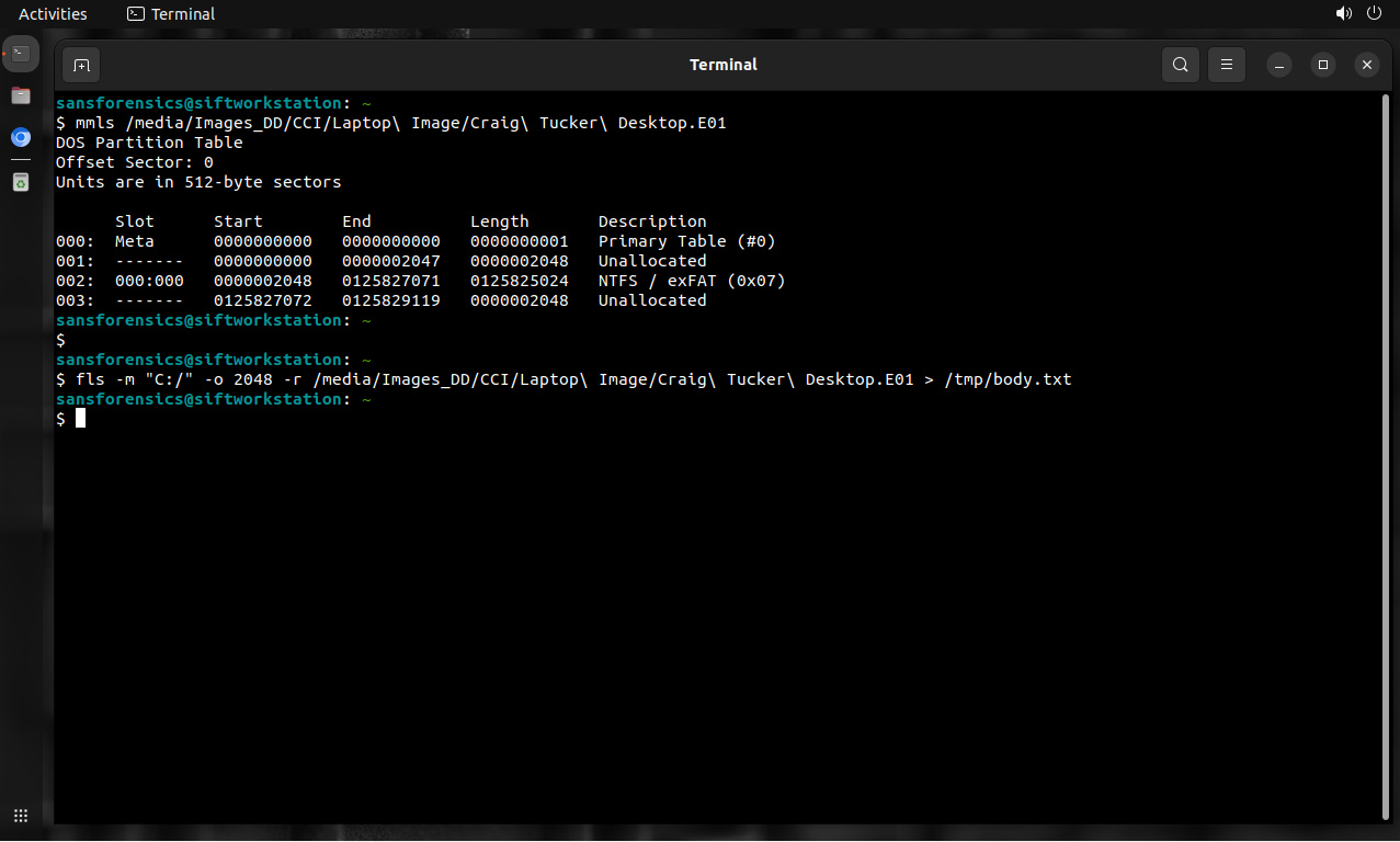 $ fls -m "C:/" -o 2048 -r Craig\ Tucker\ Desktop.E01 > body.txt