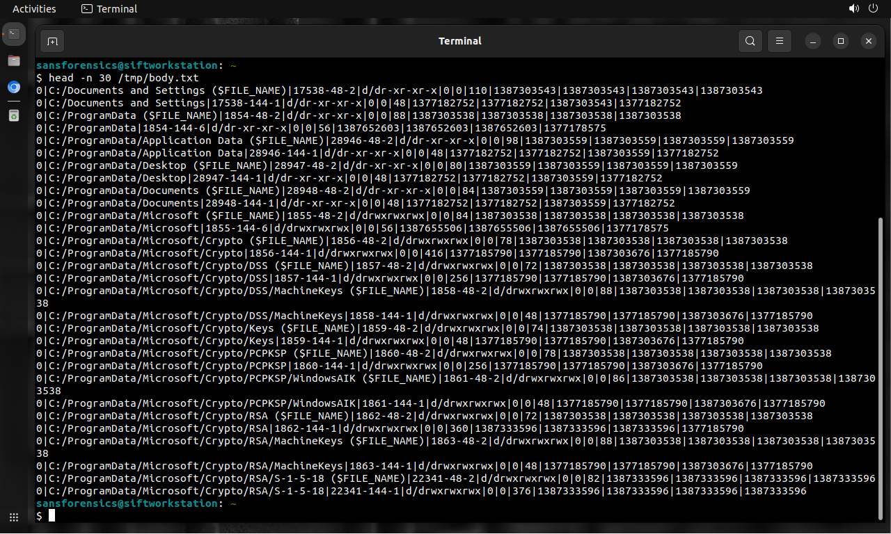 El desfase temporal del sistema puede también ser tomado en consideración durante este paso. Utilizando el argumento '-s' para “fls”, el archivo “body” puede tener tiempos ajustados para el sistema sea consistente con otros servidores.