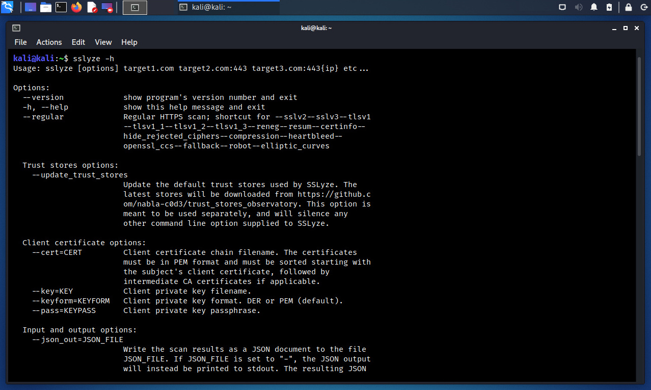 Se ejecuta SSLyze con la opción “-h” para visualizar un resumen de sus principales opciones.