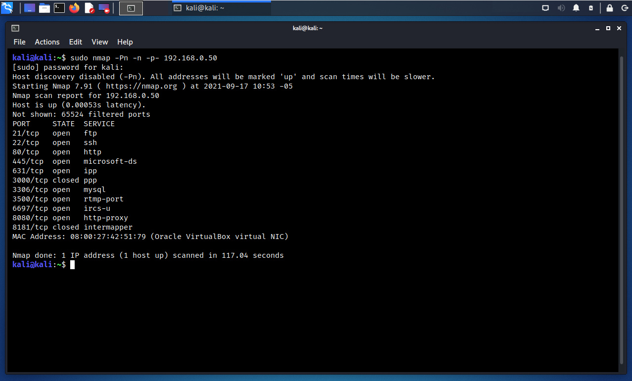 $ sudo nmap -Pn -n -sV -p- 192.168.0 .50