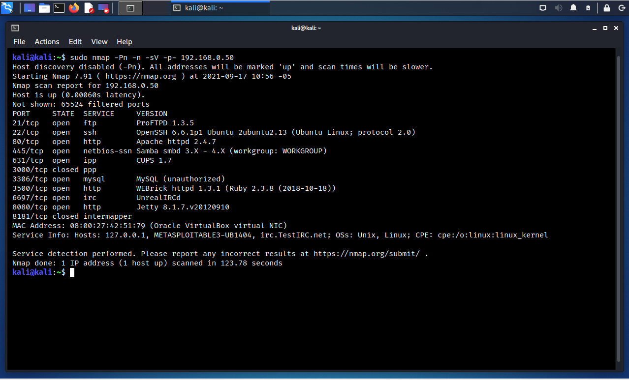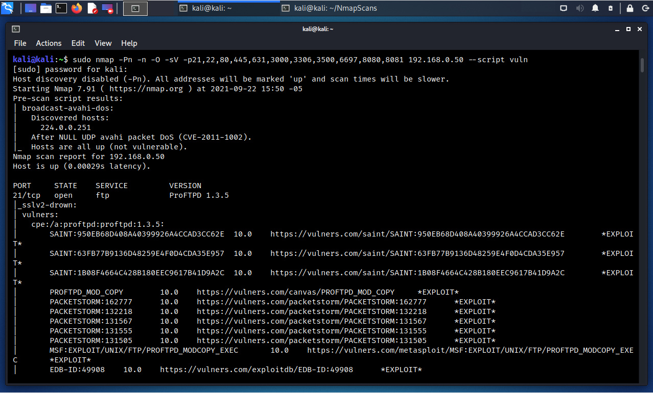 $ sudo nmap -Pn -n -O -sV -p21,22,80,445,631,3000,3306,3500,6697,8080,8181 192.168.0 .50 –script vuln