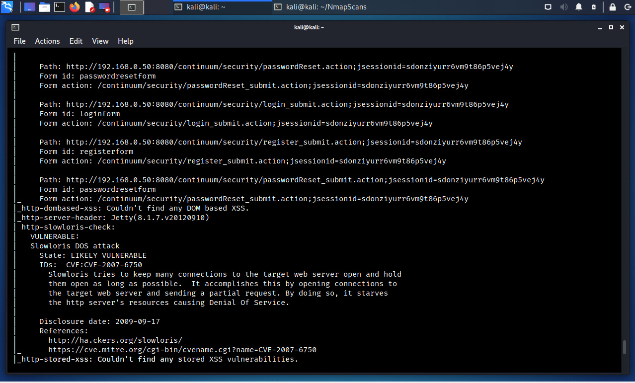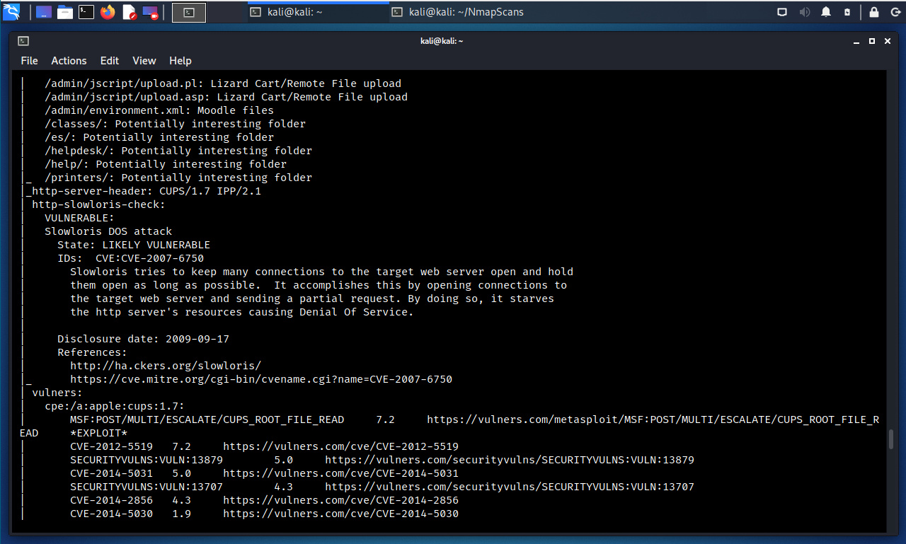 Se ejecuta Nmap definiendo la utilización de la categoría NSE “vuln”. Dado el hecho haberse realizada un escaneo anterior, se definen únicamente los puertos encontrados en estado abierto.