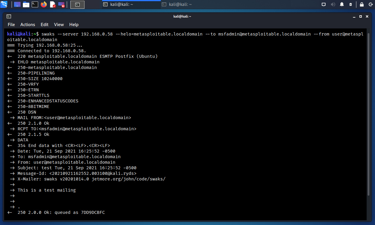 $ swaks –server 192.168. 0.58 --help=metasploitable.localdomain --to msfadmin@ metasploitable.localdomain --from user@ metasploitable.localdomain