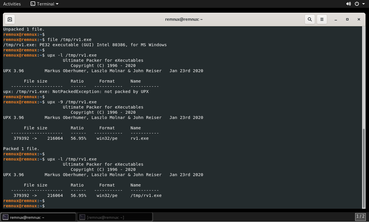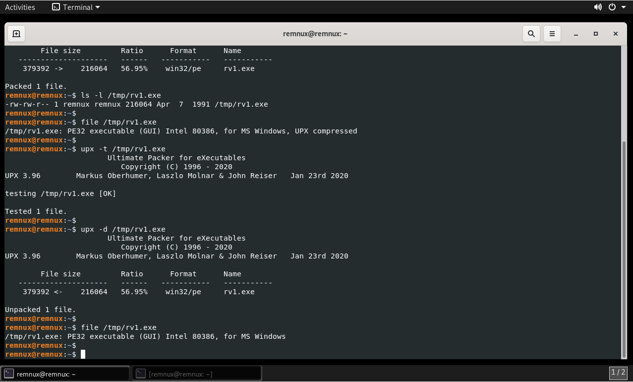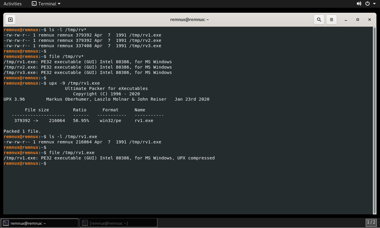 Se resalta el hecho el tamaño del archivo disminuyó. Así mismo al ejecutar el comando “file” sobre el archivo se presenta el texto “UPX compressed.”